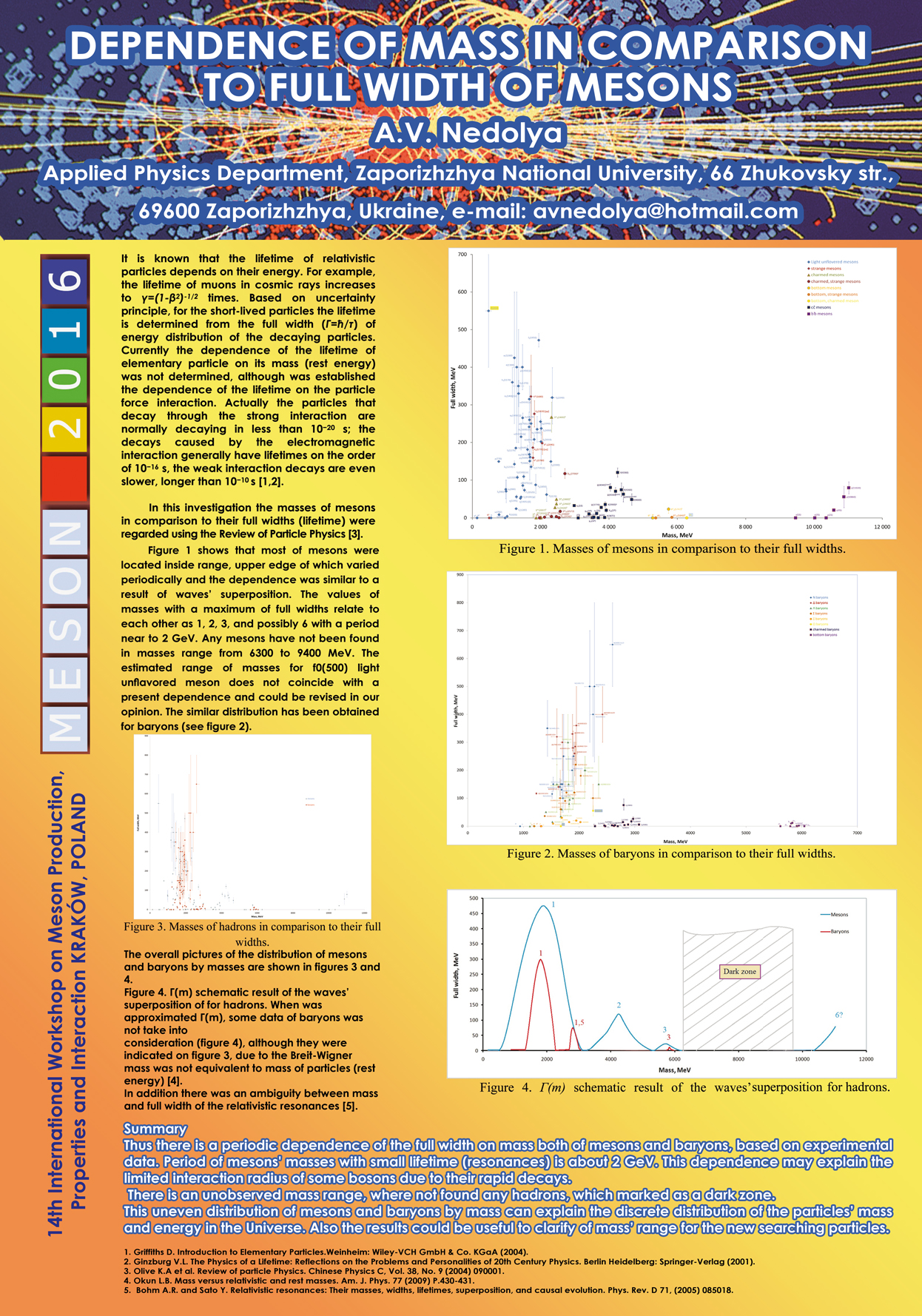 It is known that the lifetime of relativistic particles depends on their energy. For example, the lifetime of muons in cosmic rays increases to $\gamma=(1-\beta^2)^{-1/2}$ times. Based on uncertainty principle, for the short-lived particles the lifetime is determined from the full width ($\Gamma=\hbar/\tau$) of energy distribution of the decaying particles. Currently the dependence of the lifetime of elementary particle from its mass (rest energy) was not determined, although was established the dependence of the lifetime on the particle from the type of fundamental interaction. We regard the mass of mesons in comparison to their full width (lifetime) using the Review of Particle Physics [1]. Figure shows that most of mesons were located inside range, upper edge of which varied periodically. Maximum values of mass relates to each other as 1, 2, 3, and possibly 6 with a period near to 2 GeV. Any mesons have not been found in mass range from 6300 to 9400 Mev. The estimated range of mass for $f_o(500)$ light unflavored meson does not coincide with a present dependence and should be revised in our opinion. The similar distribution has been obtained for baryons. This uneven distribution of mesons and baryons explains the discrete distribution of the particles’ mass and energy in the Universe. The results may be useful to clarify range of mass for the new searching particles.